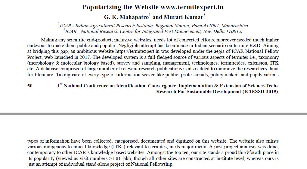 Dr G K Mahapatro is the principal investigator of this "National Fellow Project (ICAR)" and a Nodal Officer (Termite Control) for the Indian Agricultural Research Institute, Pusa, New Delhi.